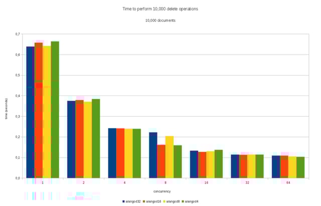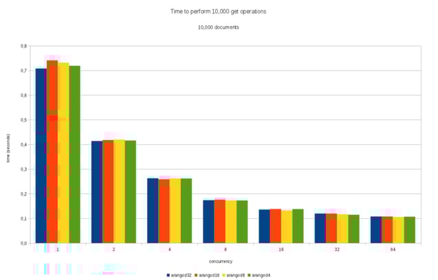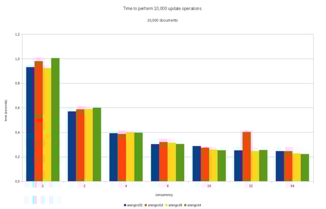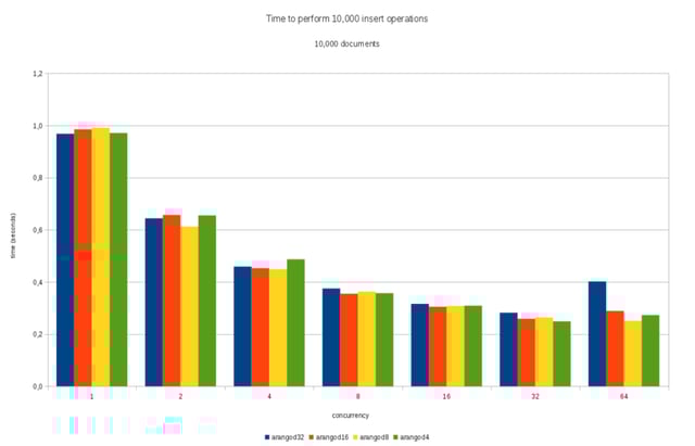 The results shown in the charts were generated by a test that started a new ArangoDB database instance with a specific journal size (using the –database.maximal-journal-size startup option), and then used the ArangoDB HTTP API to insert a number of documents from a file into the collection in the database. The inserts were done individually and not in batches. That means to insert 10,000 documents, 10,000 individual HTTP requests were executed. These inserts were done with varying concurrency levels from 1 (no concurrency) to 64 clients. The total test time on the client side was recorded.