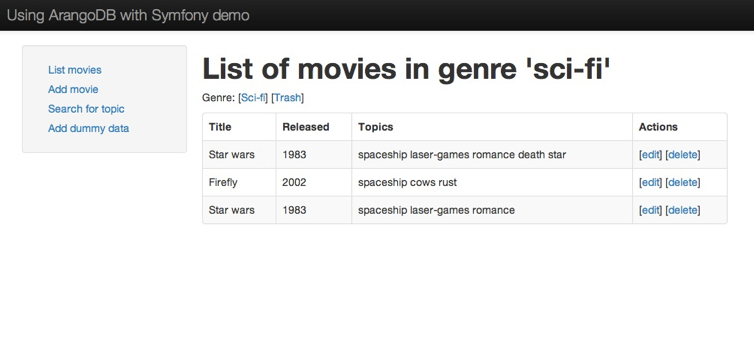 In this tutorial we will implement a very simple movie database as an example of how to use ArangoDB together with Symfony 2. We assume for the tutorial that you know the basic concepts of Symfony2. No prior ArangoDB knowledge is required.