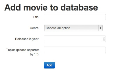This is how our form will look like. The topics are represented as a text field and the user is required to separate them by commas. This delivers questionable user experience, but leads to an interesting question: how can we transform our topics array from our movie document to a text field? And: we’ll need it at least two times, both for creating and editing movies.