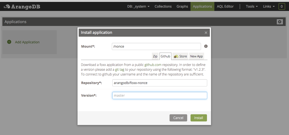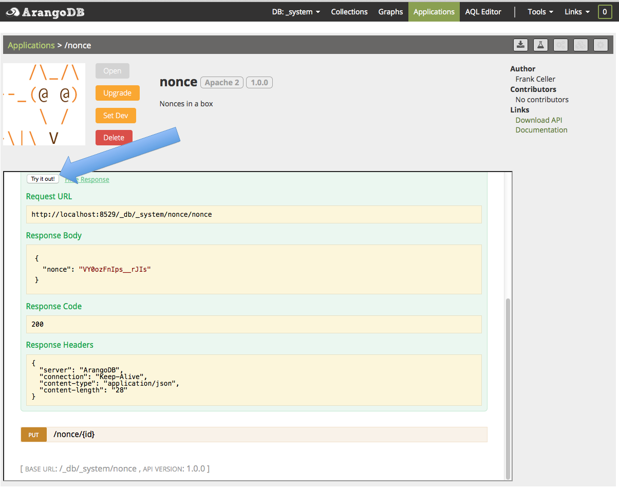 First of all, let’s test our shiny new application locally. Startup an ArangoDB and use the frontend to install the nonce service from github