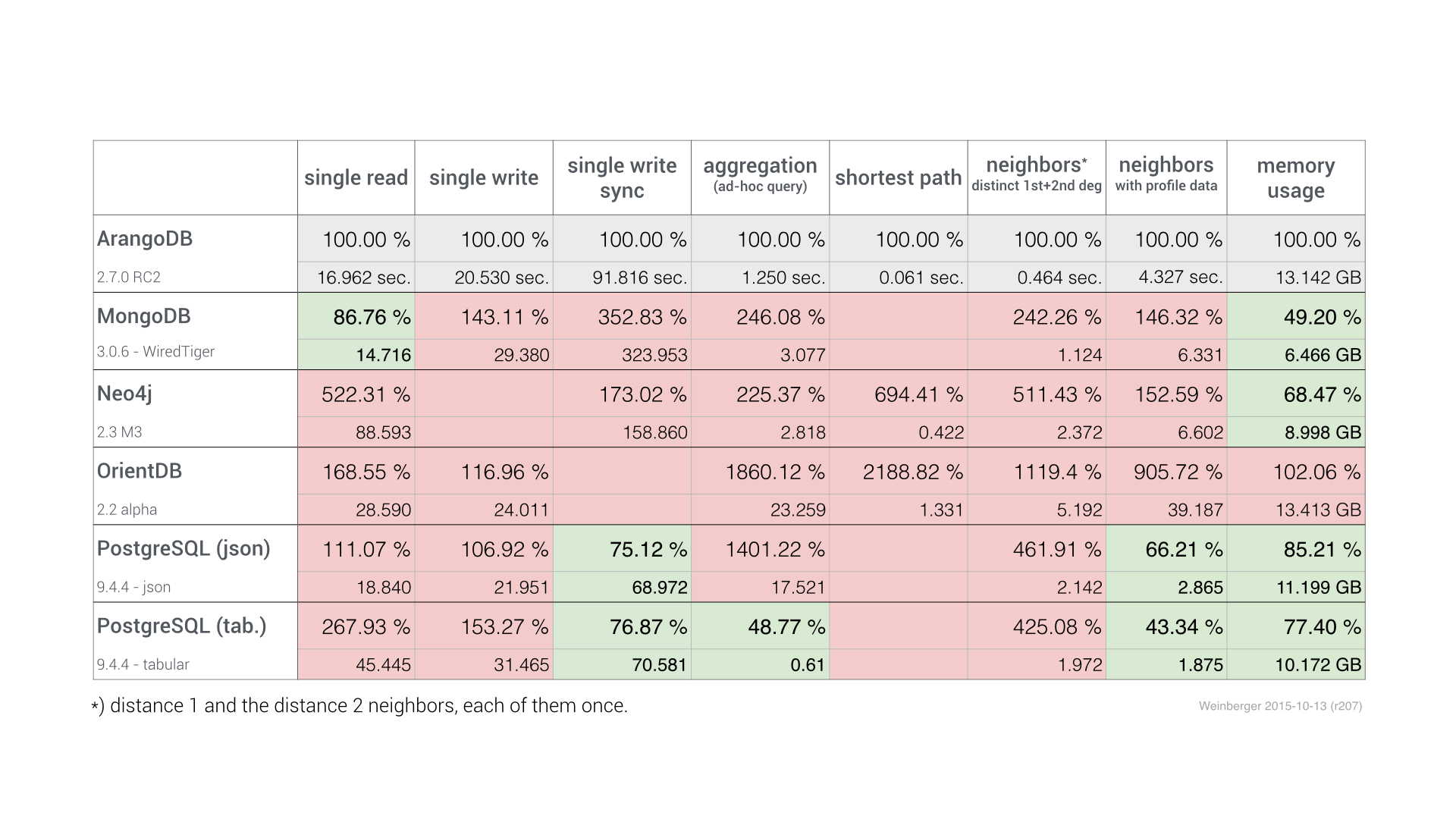 For this edition of the performance test I have also updated the software sources, replacing the custom preview/snapshot versions with the latest available products (releases or release candidates) of the particular databases and a NodeJS version bumped to 4.1.1. In response to a user feedback I have also added another test – returning the whole profile data when requesting neighbors of neighbors and increased the number of test cases for shortest path (40 instead of 19) and aggregation (1,000 instead of 500 vertices) due to performance improvements of all databases in the test field.