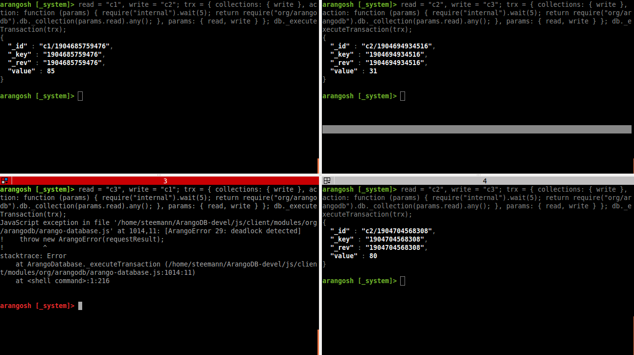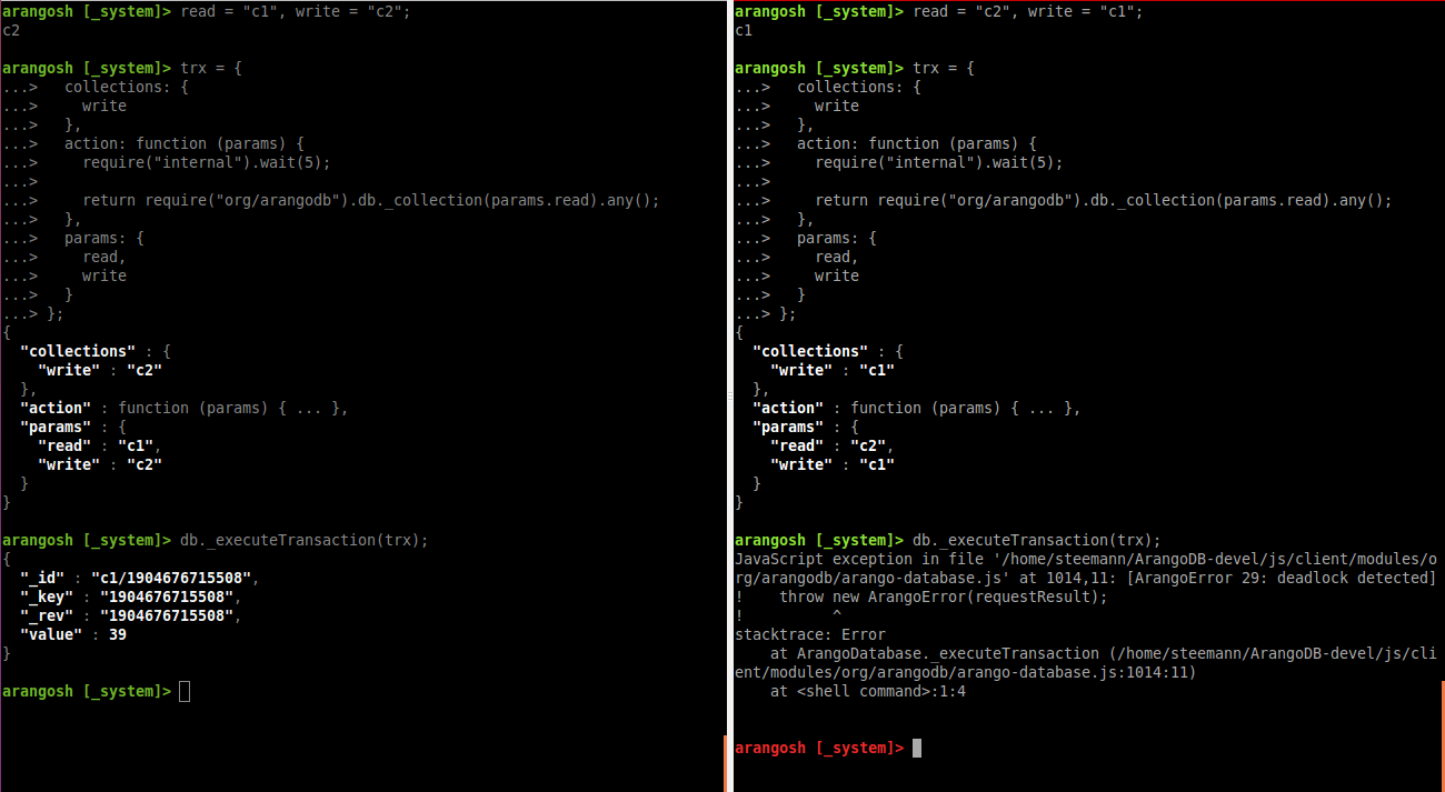 Here’s these such two transactions being started from two ArangoShell instances in parallel (left is A, right is B):