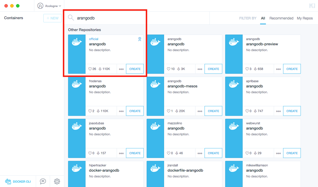 Searching for ArangoDB you get the official Docker Hub Image as the first result – and by default, the latest stable release.