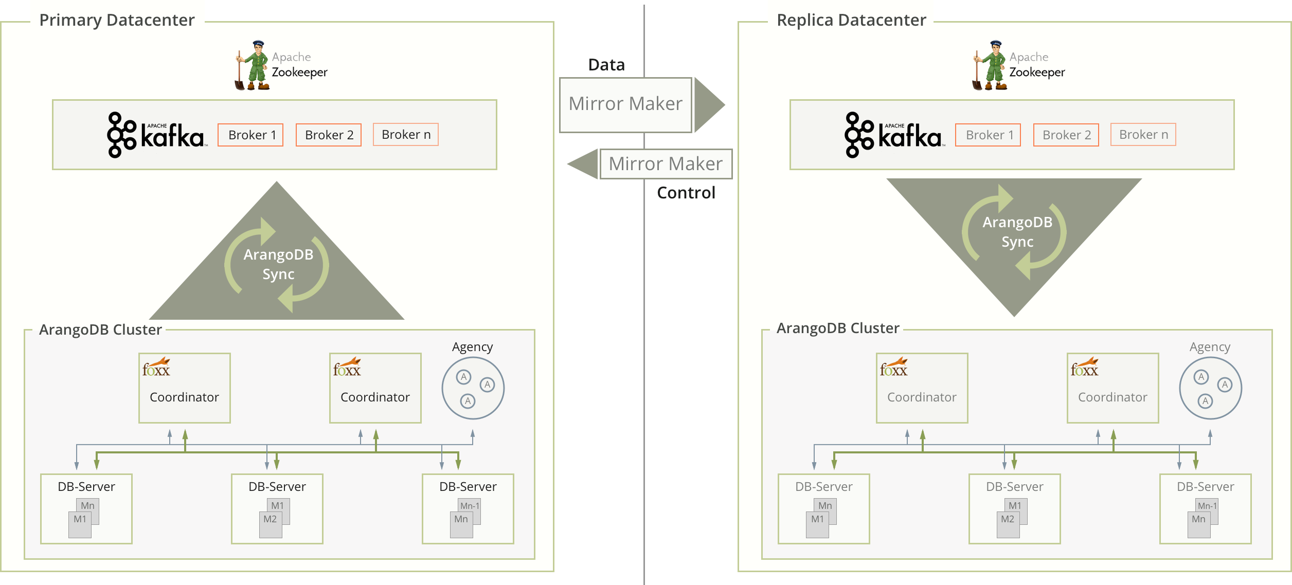 The flow of data is as follows: It starts at some DBserver of the ArangoDB cluster, goes to one of the SyncWorkers in Datacenter A, then into Kafka in Datacenter A. From there MirrorMaker moves it to Datacenter B, where it is picked up by some SyncWorker and finally written into a coordinator in Datacenter B. Obviously, there are some control messages flowing in the opposite direction, but they also use the two Kafkas and the MirrorMaker transport.