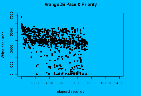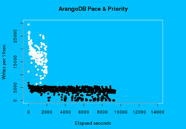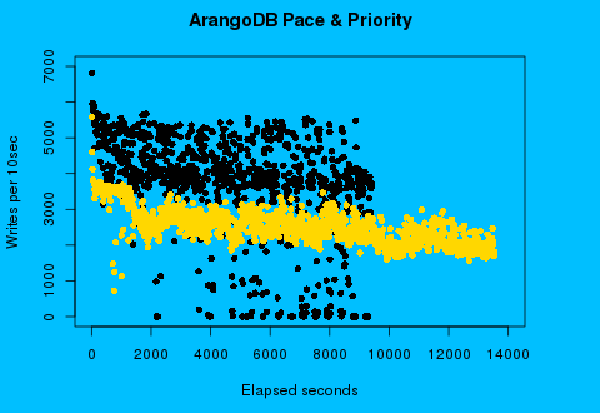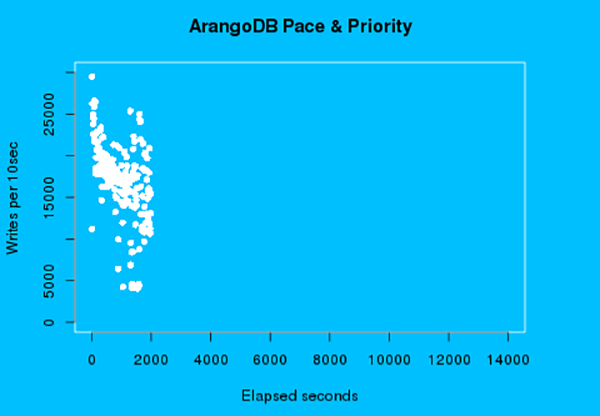 The gold dots represent the writes per 10 second interval with ArangoDB’s added algorithms. The same server hardware is used to produce the gold dots as the black, only change is the additional algorithms. The median import rate 2,460 writes per 10 second interval. The worst case 720 writes. But there are no zero intervals and write quickly settles into a steady rate after 15 minutes.