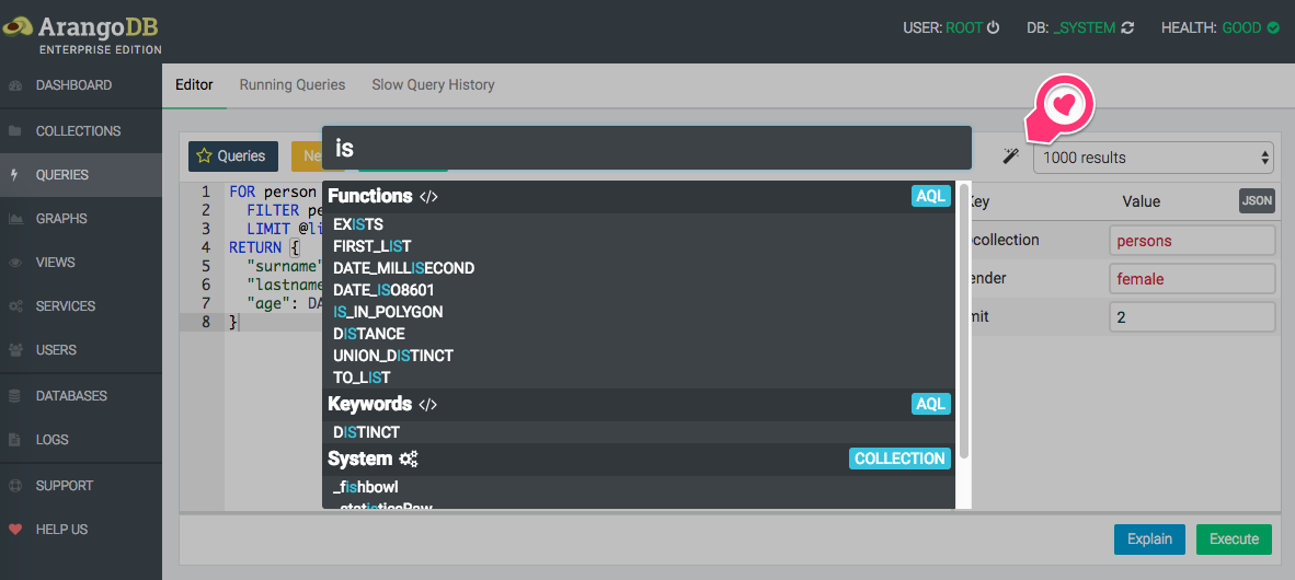 At the top you are able to manage custom defined queries and store them into your database. Also one can limit the total amount of returned queries or use the magic wand icon to search for collections (filtered by their type), AQL keywords and AQL functions to help you to be more productive in writing your queries.