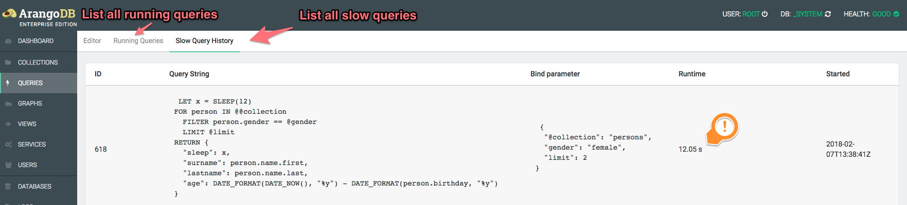 In case the default value of 10.0 seconds is not fitting into your production/development setup, you are of course allowed to change the slow query parameter via the ArangoDB Shell. Following example is setting the slow query threshold to one (1.0) second.