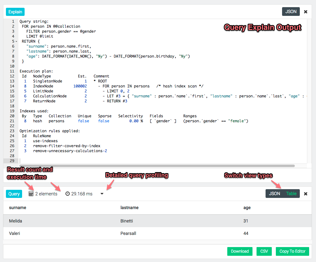 Each query you execute or explain opens up a new result box, so you are able to fire up multiple queries and view their results at the same time. Every query result box gives you detailed query information (e.g. query profiling information, total amount of returned values) and of course the query result itself.