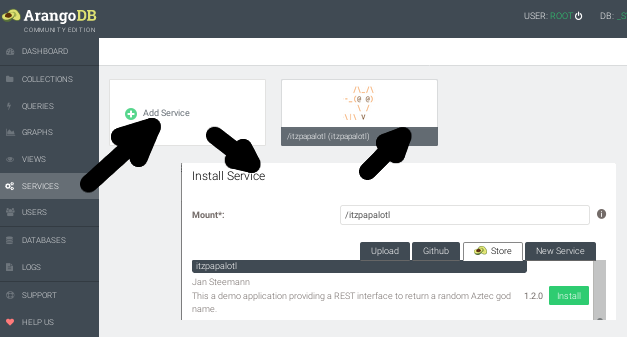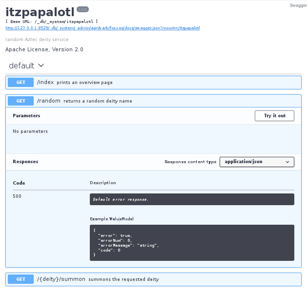 Foxx autogenerates a Swagger API definition for you. To browse that autogenerated documentation, we will install one of the sample apps provided (Itzpapalotl):
