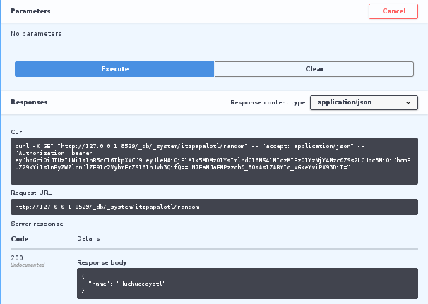We can see again that the JWT is passed along. Since the routes of a foxx app don’t neccessarily need the authentification of the host, we may also invoke the random route without the token: