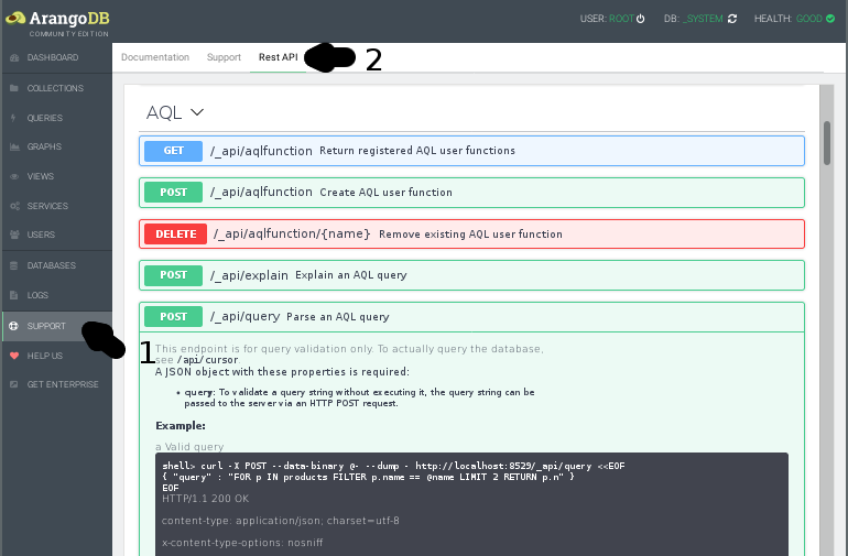 As shown above, we scrolled down to AQL and clicked on POST /_api/query.