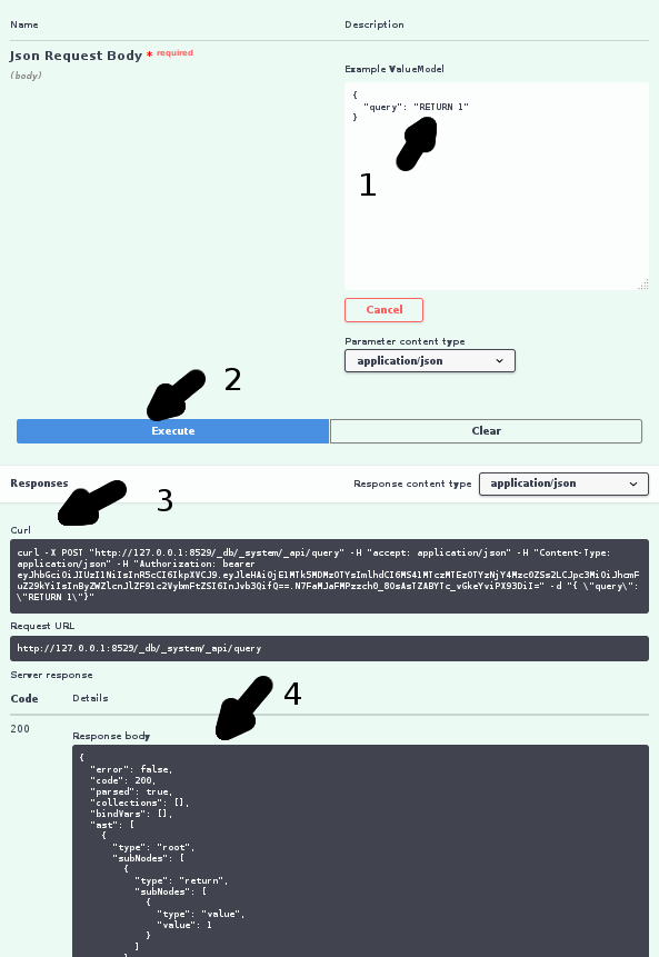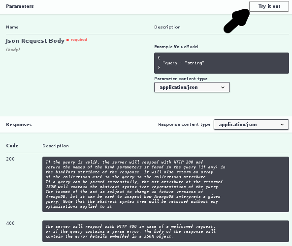Now you’ve loaded the Swagger.io API documentation, let’s play with it. We’re choosing a route that accepts a simple JSON post document. Executing a simple AQL Query does so.