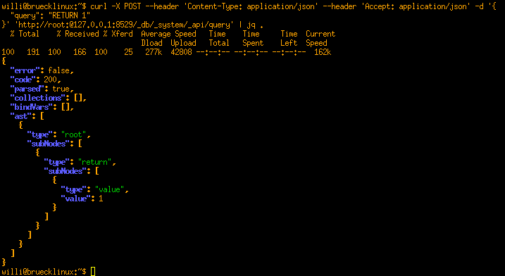 Swagger will generate an example curl commandline (3) and talk to the ArangoDB Server, and put the result into the output (4). For this example it will re-use the JSON Web Token of your current web-session. Since we may not neccessarily want to use JWT in curl, we will choose HTTP Basic authentification in our shell (for the user root with an empty password):