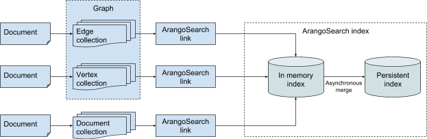 There are 2 separate indexes per each view: in-memory index and persistent index. All documents coming from the links first get into the in memory index and eventually (in asynchronous fashion) appear to be in the latter. Having 2 separate indexes is the crucial part for fast startup and recovery since ArangoSearch views don’t need to reindex all data from linked collections. Merging memory part into persistent store is also quite important since ArangoSearch view doesn’t want to consume all your RAM.